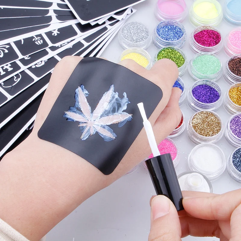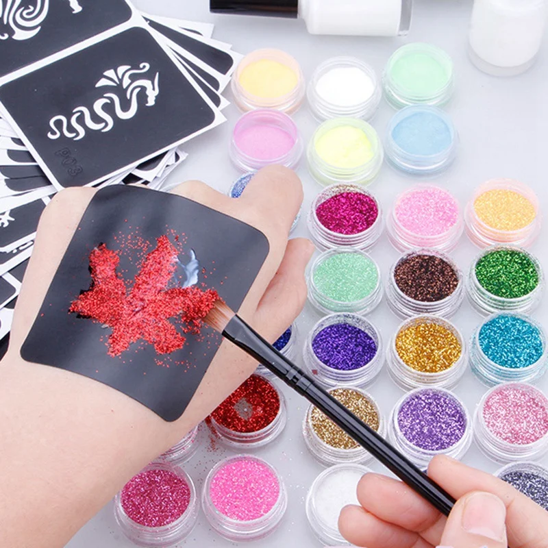 Related Product for 26 Colors/6 Colors Powder Temporary Shimmer Glitter Tattoo Kit For Body Art Design Paint With Stenc